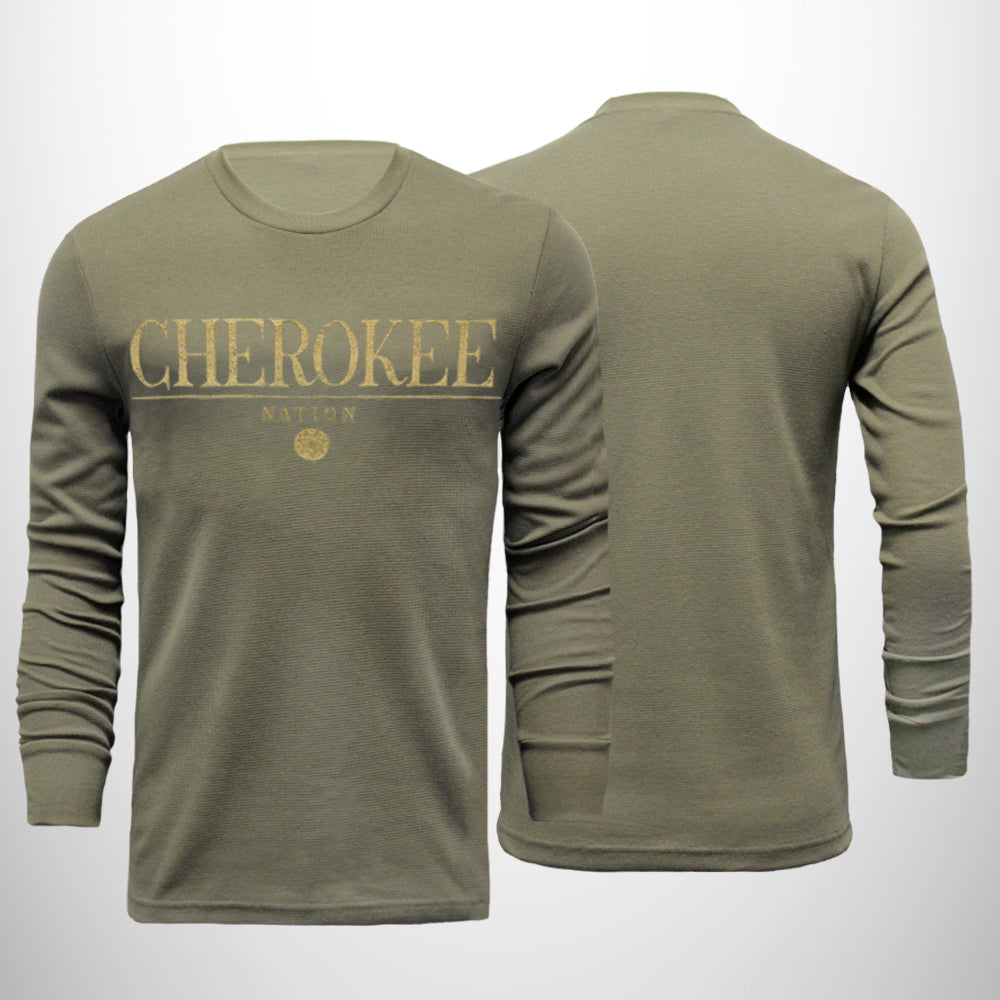 Stay warm and cozy in cooler temps with this thermal featuring "Cherokee Nation" in a classic gold color on military green.