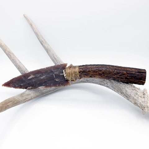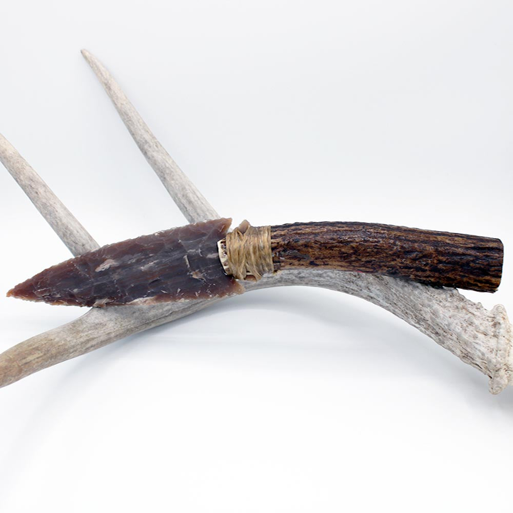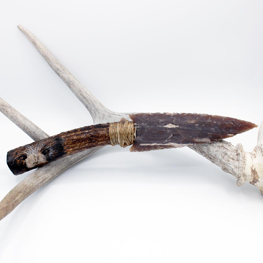 Hand-knapped, flint blade attached to elk antler handle that features carving work of bear eyes on the handle and bear paw on the butt of the knife. Blade secured with adhesive and imitation sinew. Work done by Cherokee artist Jeffrey Watt.