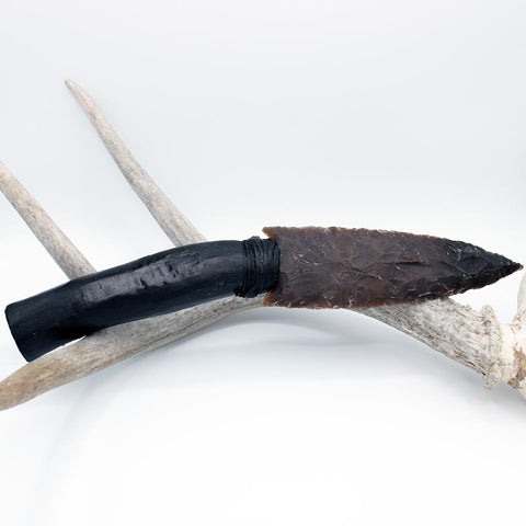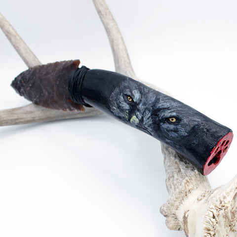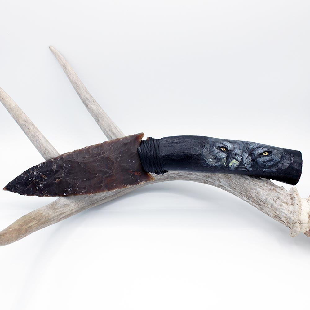 Hand-knapped, flint blade attached to elk antler handle that features carving work of wolf eyes on the handle and wolf paw on the butt of the knife.  Blade secured with adhesive and imitation sinew.  Work done by Cherokee artist Jeffrey Watt.