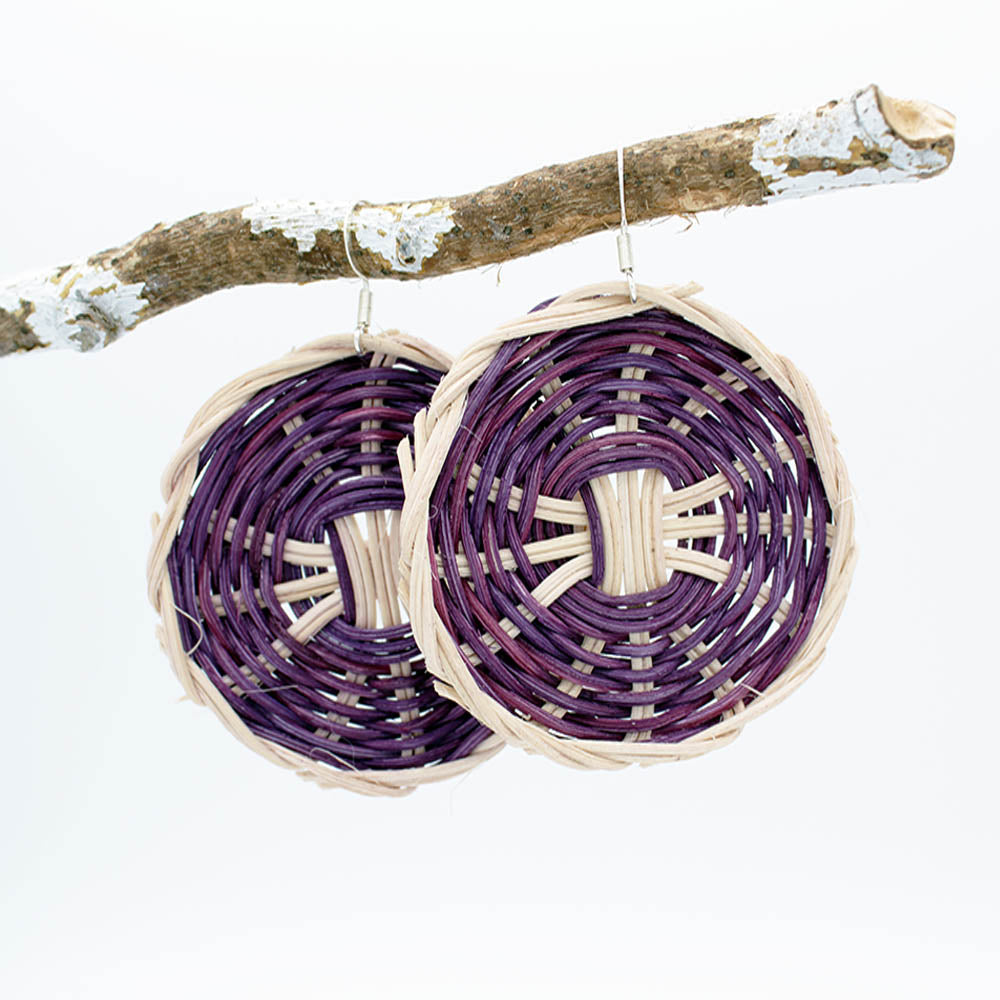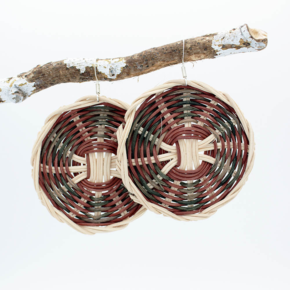Beautifully woven basket reed on French hook earrings by Cherokee artist Juan Ramos. Commercial reed and dye.