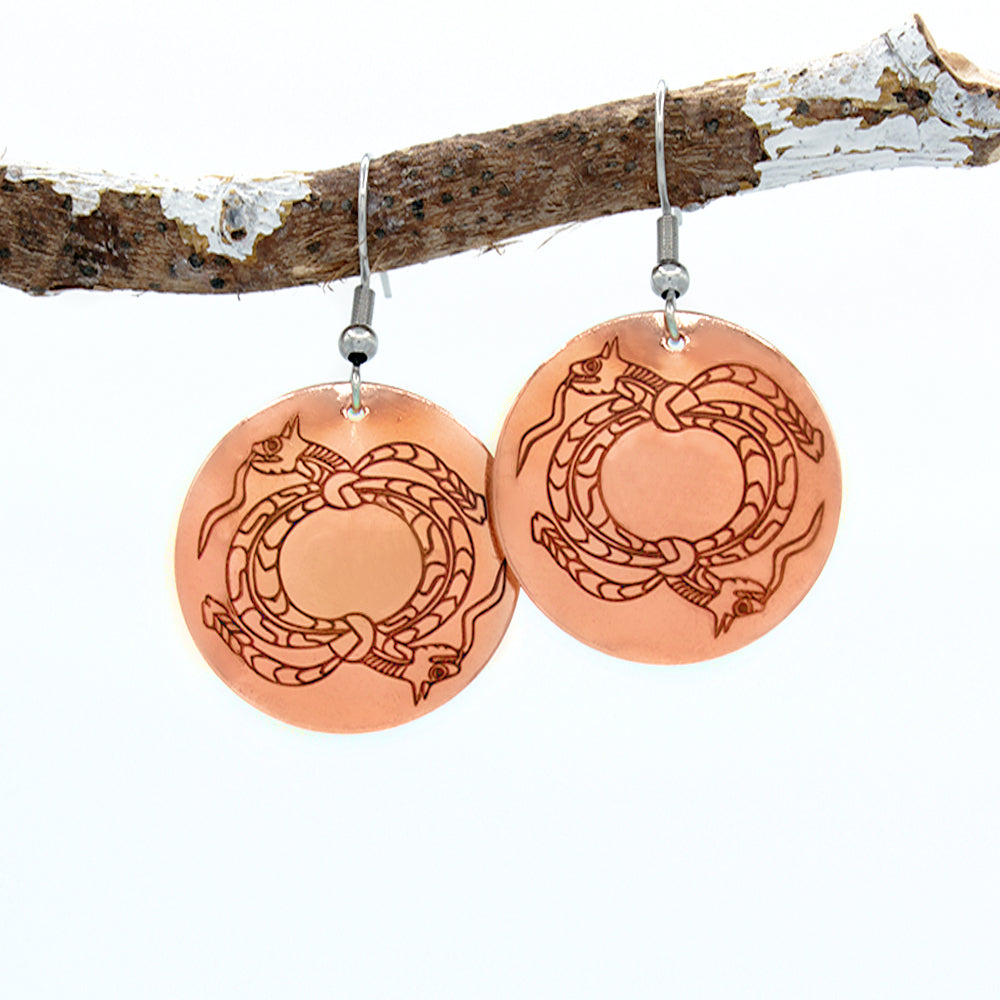 The Cherokee story of Uktena centers on a powerful, horned serpent with wings on its back and a blazing crystal on its forehead. Made by award winning Cherokee Coppersmith Greg Stice.