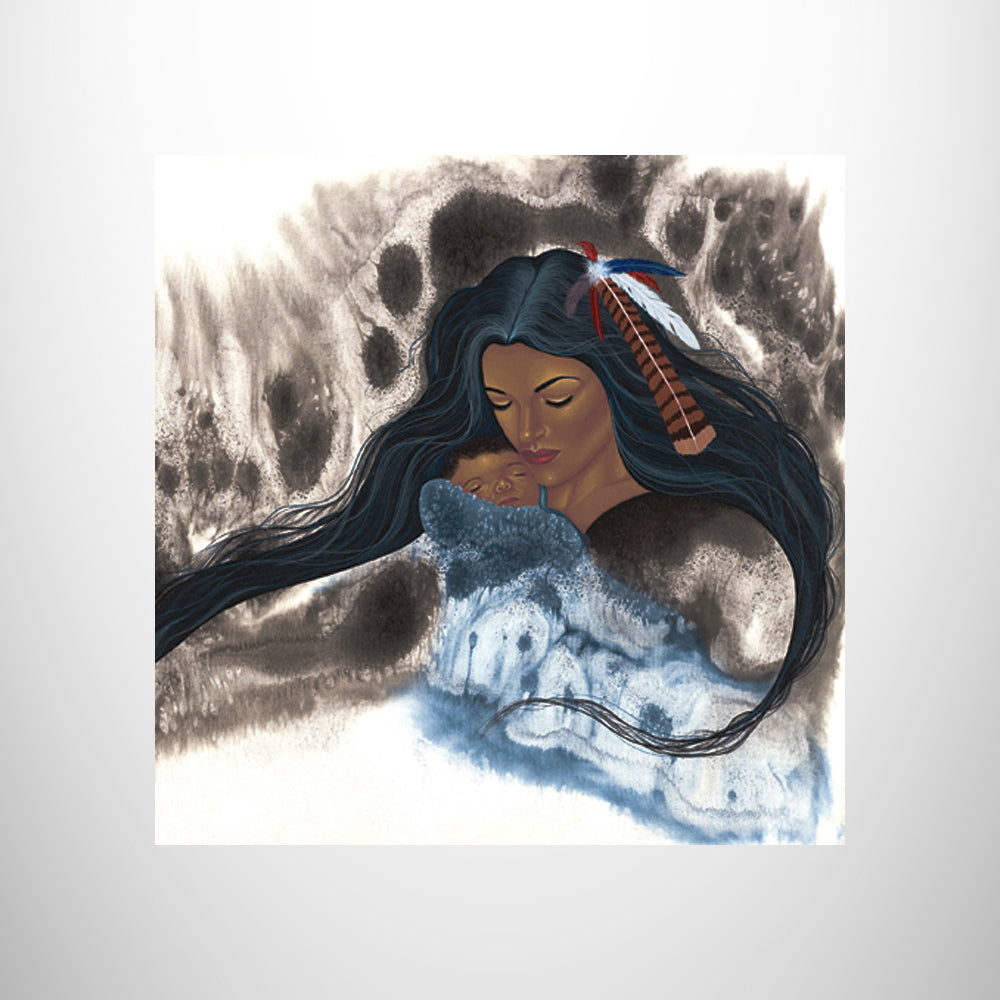 "First Born" print by Cherokee National Treasure Traci Rabbit on tile. Tile comes with a kickstand backing for easy shelf or desk decorating.