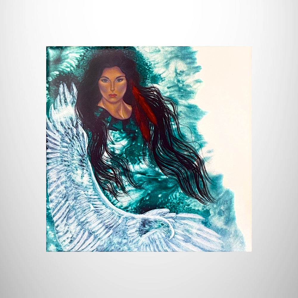 "Free as the Wind" print by Cherokee National Treasure Traci Rabbit on tile. Tile comes with a kickstand backing for easy shelf or desk decorating.