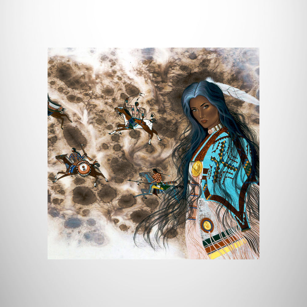 "Legends" print by Cherokee National Treasure Traci Rabbit on tile.  Tile comes with a kickstand backing for easy shelf or desk decorating.